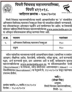 PCMC Recruitment 2024: Apply for 150 Fire Extinguisher/Fireman Rescuer Positions at PCMC in Pimpri, Maharashtra. Officials from the Pimpri Chinchwad Municipal Corporation have released a recruitment notice to fill 150 positions online. The PCMC job official website, pcmcindia.gov.in recruitment 2024, is open to all qualified candidates. The online application last date is April 30, 2024, at the latest.
