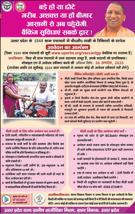 UPSRLM Recruitment 2023 Apply for the 1544 BC Sakhi positions available in Uttar Pradesh. Officials from the UP State Rural Livelihood Mission recently posted a job notice to fill 1544 positions online. All qualified candidates should visit the UPSRLM career page on the official website, upsrlm.in recruitment 2023. The deadline to apply online is August 26, 2023, or earlier.